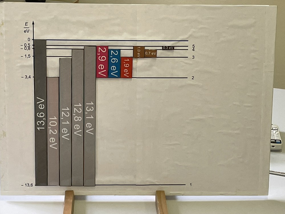Základní energetická hladina atomu vodíku a naznačená emisní spektra ve třech sériích.