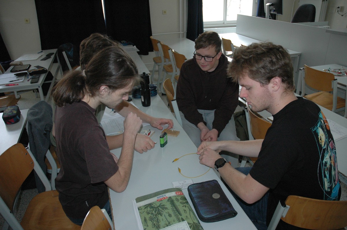 O týden později zkoušejí sestavit obvod s tranzistory žáci druhé poloviny třídy.